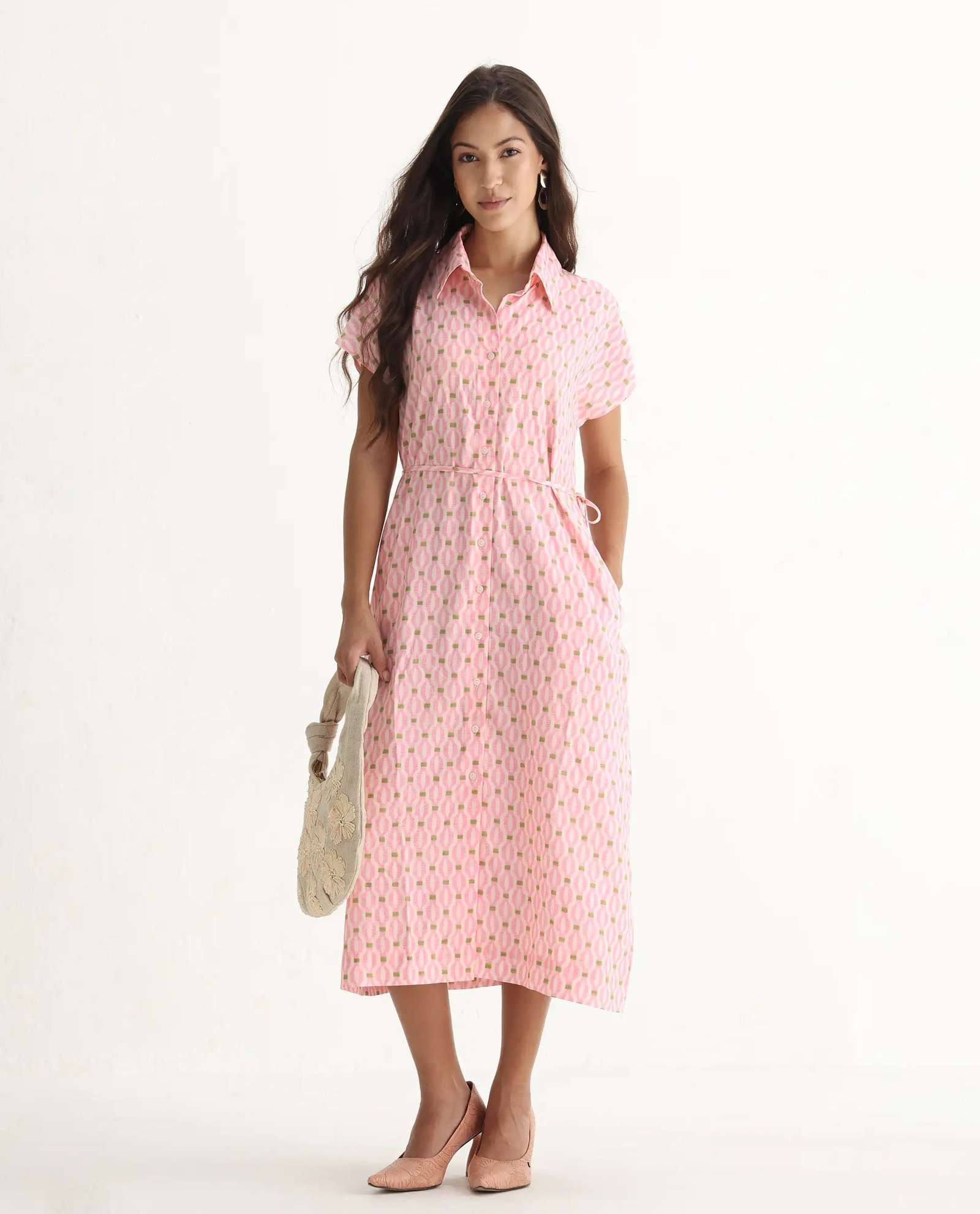 This Rareism Eleen Pink dress features a classic collared neck and button closure. combining elegance with ease of wear. Its A-line silhouette flatters various body types. while the midi length offers a versatile option for both casual and semi-formal occasions. The printed fabric adds a subtle yet stylish touch. making it a refined choice for your wardrobe.
